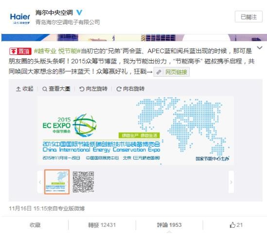 海爾中央空調(diào)向社會“眾籌節(jié)博藍”